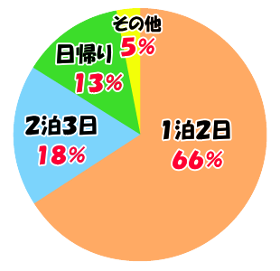 次いで『2泊3日』『日帰り』の順に多く、全体を通して2日間以内の比較的少ない日程での旅行が一般的となっています。